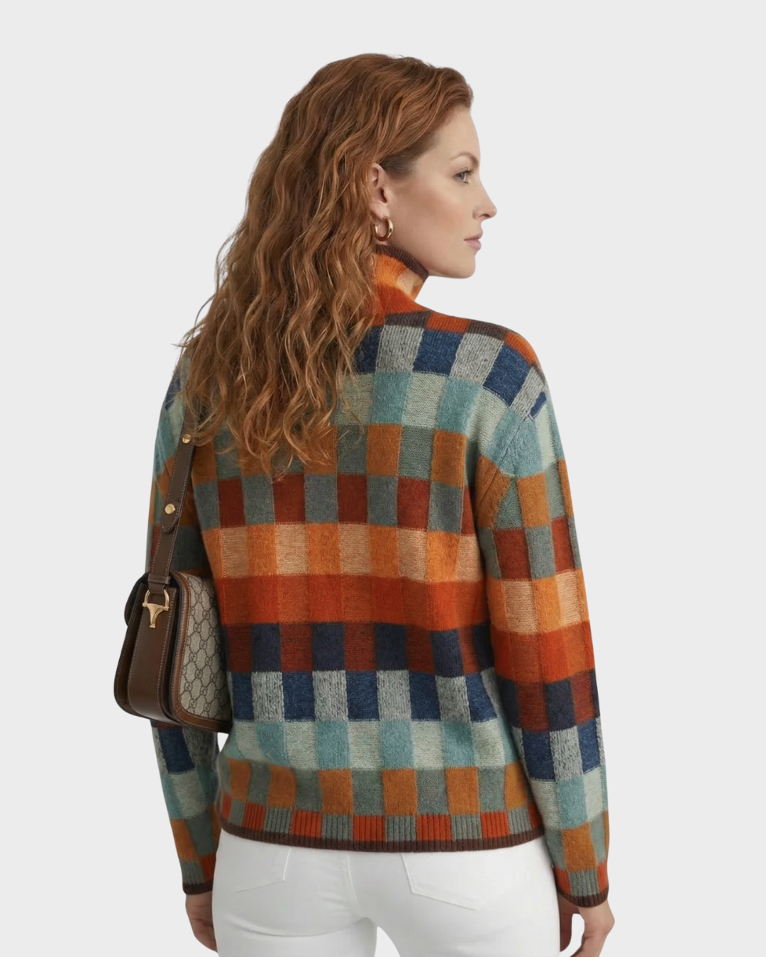 Este suéter de cuello alto con un diseño de estampado geométrico es perfecto para quienes buscan añadir un toque de color y estilo a su vestuario diario. Su diseño moderno y su corte favorecedor lo convierten en una prenda ideal para crear outfits cómodos y originales. Perfecto para combinar con jeans, pantalones o faldas, aportando un aire fresco y contemporáneo a tu look.